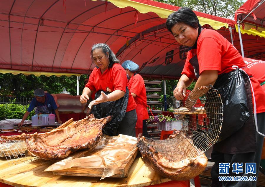 6月14日,工作人員在廣州天河區(qū)珠村七夕廣場(chǎng)準(zhǔn)備龍舟飯。當(dāng)日,廣州市天河區(qū)舉行一場(chǎng)熱鬧歡快的龍舟活動(dòng),來(lái)自多個(gè)村莊“走親戚”的龍舟隊(duì)參加。按廣州的傳統(tǒng)習(xí)俗,每年農(nóng)歷五月初一至初五,各村的龍舟隊(duì)要到周?chē)迓洹白哂H戚”。走親戚的龍舟隊(duì)到來(lái)時(shí),受訪村子要準(zhǔn)備好龍舟飯招待來(lái)客。活動(dòng)當(dāng)天,鳴炮敲鑼,一派喜慶氣氛。新華社記者 鄧華 攝