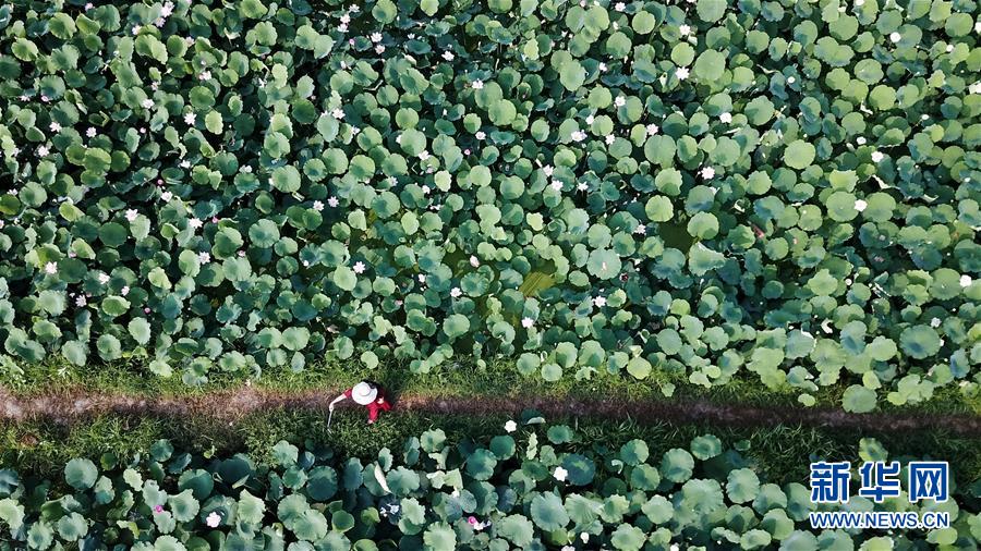 6月14日,游客在銅陵市西湖村荷花園內賞荷(無人機拍攝)。隨著氣溫升高,安徽省銅陵市西聯(lián)鎮(zhèn)西湖村荷花園內的300多畝荷花絢麗綻放,吸引游客前來賞荷。 新華社記者 張端 攝
