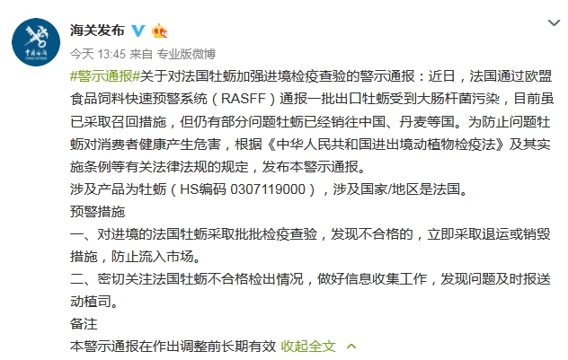 據(jù)中國海關(guān)總署辦公廳官方微博消息,海關(guān)總署今日發(fā)布關(guān)于對法國牡蠣加強進境檢疫查驗的警示通報,通報稱,近日,法國一批出口牡蠣受到大腸桿菌污染,目前雖已采取召回措施,但仍有部分問題牡蠣已經(jīng)銷往中國、丹麥等國。通報預警措施,要求對進境的法國牡蠣采取批批檢疫查驗,發(fā)現(xiàn)不合格的,立即采取退運或銷毀措施,防止流入市場。