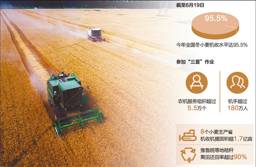 據(jù)農(nóng)業(yè)農(nóng)村部統(tǒng)計,今年全國參加“三夏”作業(yè)的農(nóng)機服務(wù)組織預(yù)計超過5.5萬個,機手超過180萬人,截至6月19日,全國冬小麥機收水平達(dá)到95.5%,8個小麥主產(chǎn)省機收、機播服務(wù)面積超過1.7億畝。全程機械化特點明顯,各地主推“一條龍”作業(yè),在搶收小麥的同時,玉米機播隨即展開,夏收、夏種、夏管這“三夏”正在變成“兩夏”。