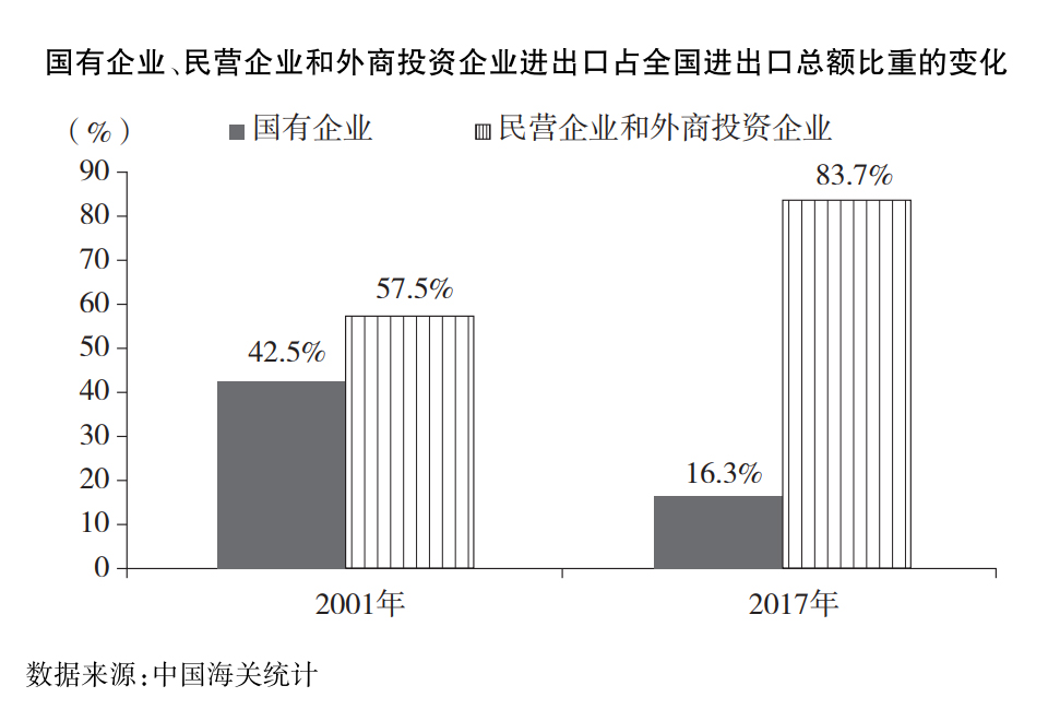 全面放開外貿(mào)經(jīng)營權。促進經(jīng)營主體多元化,激發(fā)各類企業(yè)開展貿(mào)易的積極性。自2004年7月起,中國對企業(yè)的外貿(mào)經(jīng)營權由審批制改為備案登記制,極大地釋放了民營企業(yè)的外貿(mào)活力,民營企業(yè)進出口發(fā)展迅速,份額持續(xù)擴大,成為對外貿(mào)易的重要經(jīng)營主體。民營企業(yè)和外商投資企業(yè)進出口占全國進出口總額的比重由2001年的57.5%上升到2017年的83.7%。2017年,作為第一大出口經(jīng)營主體的民營企業(yè)出口占比達46.6%。