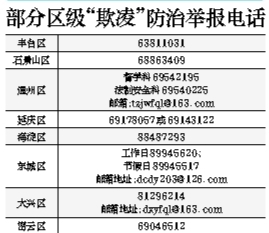 北京青年報(bào)記者注意到,東城、海淀、朝陽、豐臺(tái)、石景山、延慶等各區(qū)都建立了由多部門共同組成專門的防治中小學(xué)校欺凌領(lǐng)導(dǎo)小組,來統(tǒng)籌領(lǐng)導(dǎo)和指導(dǎo)本區(qū)學(xué)生欺凌防治工作,協(xié)助各中小學(xué)校穩(wěn)妥處置欺凌事件。在設(shè)立專門領(lǐng)導(dǎo)小組的同時(shí),豐臺(tái)、石景山、通州、延慶以及海淀等區(qū)還公布了區(qū)級(jí)的中小學(xué)校園欺凌專屬的防治、舉報(bào)聯(lián)系電話。