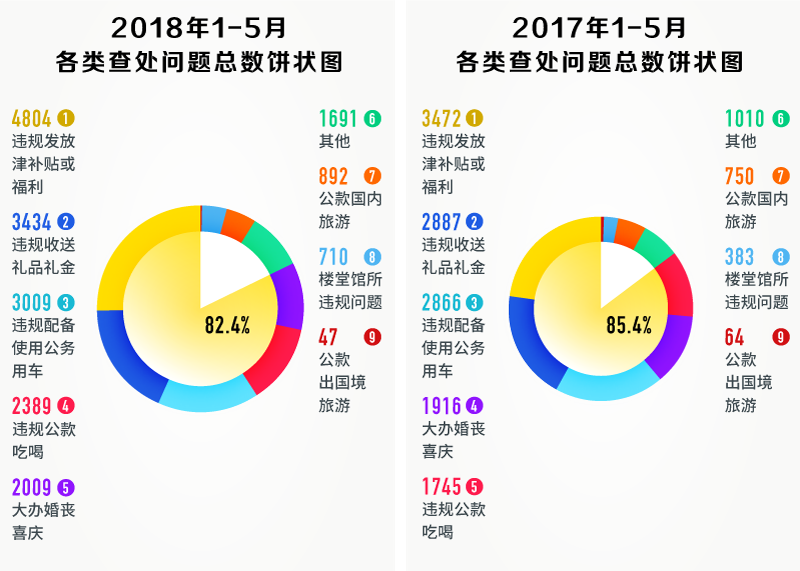 2017年、2018年1-5月各類查處問題總數(shù)餅狀圖,違規(guī)發(fā)放津補貼或福利、違規(guī)收送禮品禮金、違規(guī)配備使用公務用車、違規(guī)公款吃喝、大辦婚喪喜慶等“老問題”占比較大,均超80%