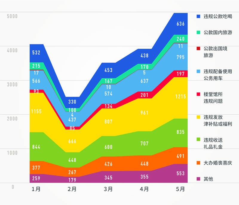 再來看,違反中央八項(xiàng)規(guī)定精神問題類型。從1至5月各類查處問題的面積分布圖來看,各類具體問題的查處趨勢(shì)也保持了較穩(wěn)定的增長(zhǎng)態(tài)勢(shì)。值得注意的是,違規(guī)發(fā)放津補(bǔ)貼或福利、違規(guī)收送禮品禮金、違規(guī)配備使用公務(wù)用車、違規(guī)公款吃喝、大辦婚喪喜慶等問題類型,相比同期仍是所有問題類型的“大頭”(占據(jù)前5名),占比仍超80%。數(shù)據(jù)顯示,這些老問題,仍需下大氣力糾治,持之以恒,久久為功。