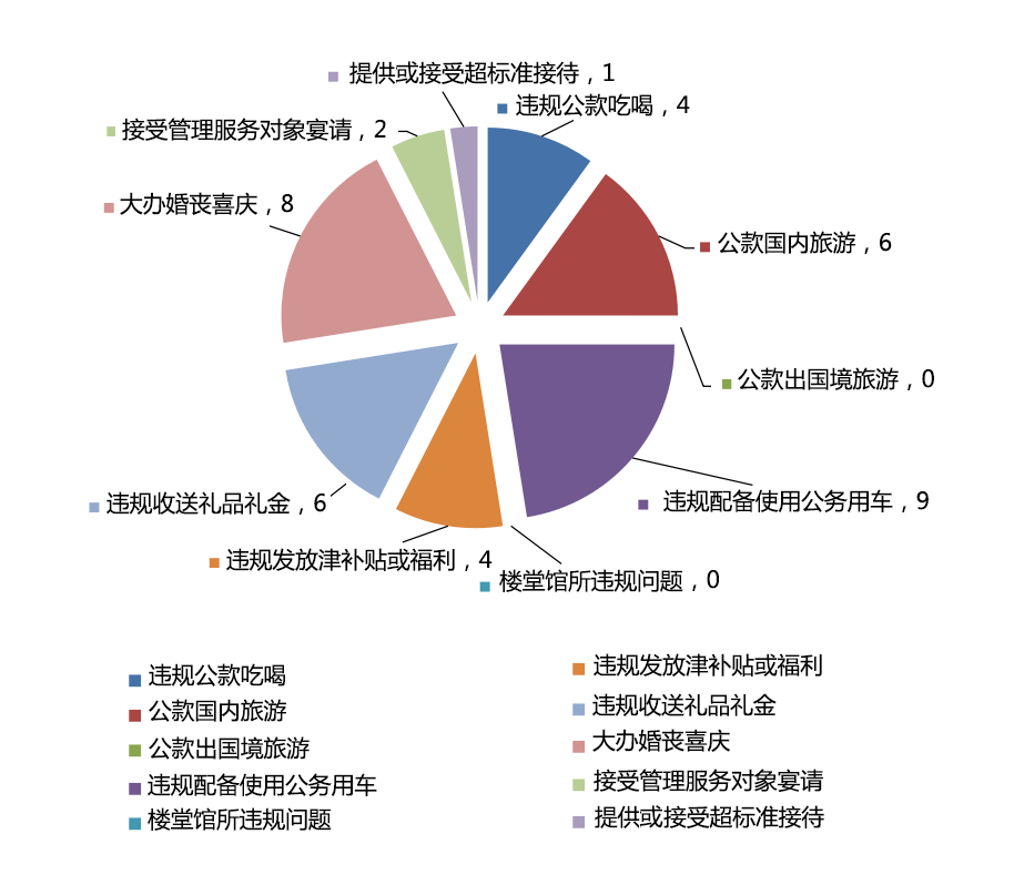 從查處問題類型看,違規(guī)問題數(shù)量較多的分別是違規(guī)配備使用公務(wù)用車問題(9起)、大辦婚喪喜慶問題(8起),公款國內(nèi)旅游問題(6起)、違規(guī)收送禮品禮金問題(6起),這四類問題占查處總數(shù)的72.5%;從處理干部級別看,查處縣處級干部4人,占7.3%;鄉(xiāng)科級及以下干部51人,占92.7%。(寧波市紀委監(jiān)委)