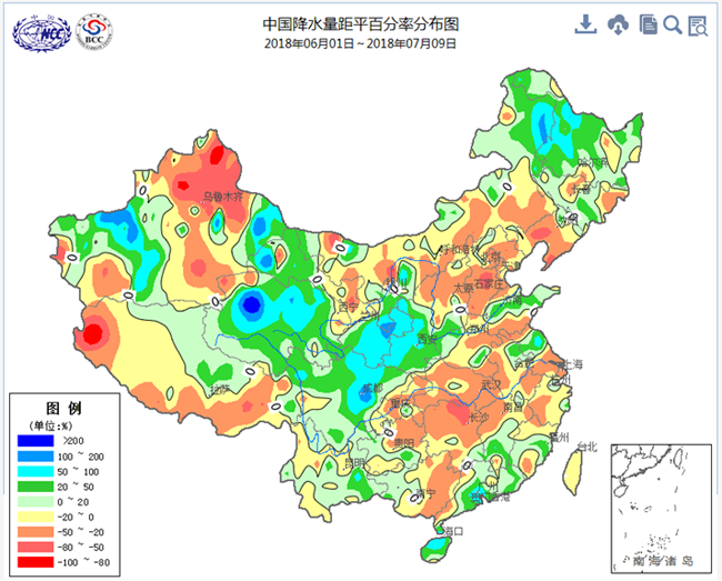 2018年6月1日-7月9日全國降水量距平百分率分布圖。