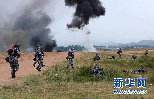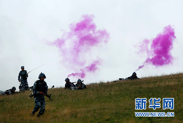 紅藍(lán)對抗中,殲“敵”信號發(fā)射后,“紅軍”主攻隊(duì)在模擬連連長指揮下,按照戰(zhàn)術(shù)編組發(fā)起進(jìn)攻(資料照片)。新華社發(fā)(姚立 攝)