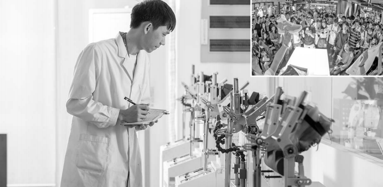 大圖:安踏投資建設(shè)的國家級運(yùn)動(dòng)科學(xué)實(shí)驗(yàn)室。小圖:安踏旗下首款全球限量籃球鞋——— KT3 Rocco 引發(fā)排隊(duì)搶購的場面。圖片由受訪者提供
