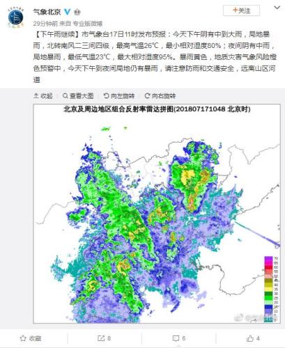 北京市氣象臺17日11時(shí)發(fā)布預(yù)報(bào):今天下午陰有中到大雨,局地暴雨,北轉(zhuǎn)南風(fēng)二三間四級,最高氣溫26℃,最小相對濕度80%;夜間陰有中雨,局地暴雨,最低氣溫23℃,最大相對濕度95%。已發(fā)布暴雨黃色、地質(zhì)災(zāi)害氣象風(fēng)險(xiǎn)橙色預(yù)警。