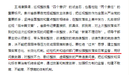 巡視發(fā)現(xiàn)問(wèn)題的目的是解決問(wèn)題,發(fā)現(xiàn)問(wèn)題不解決,比不巡視的效果還壞!本輪巡視,中央巡視組把十八屆巡視整改情況作為巡視監(jiān)督重點(diǎn),對(duì)照巡視報(bào)告、反饋意見(jiàn)以及被巡視黨組織整改報(bào)告,有重點(diǎn)地監(jiān)督檢查,看巡視發(fā)現(xiàn)的問(wèn)題是否整改到位,有沒(méi)有報(bào)假賬、做表面文章;巡視移交的問(wèn)題線索是否認(rèn)真處置、核查,巡視反映強(qiáng)烈的領(lǐng)導(dǎo)干部是否依然有反映或者有新的反映。剛剛公布的巡視反饋情況顯示,一些地方“對(duì)十八屆中央巡視發(fā)現(xiàn)的‘三超兩亂’等問(wèn)題整改落實(shí)不夠到位”“上次中央巡視整改不嚴(yán)不實(shí),存在掛空檔、走過(guò)場(chǎng)現(xiàn)象”“巡視整改存在做表面文章現(xiàn)象”。中央巡視組組長(zhǎng)在代表中央巡視組反饋巡視情況時(shí)也給出明確意見(jiàn),要求“統(tǒng)籌抓好上次巡視整改不到位和本次巡視指出問(wèn)題的整改”。