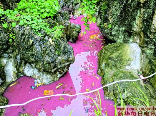 公路邊的一處水池因為種植戶傾倒的火龍果而變成了粉色。本報記者張典標攝
