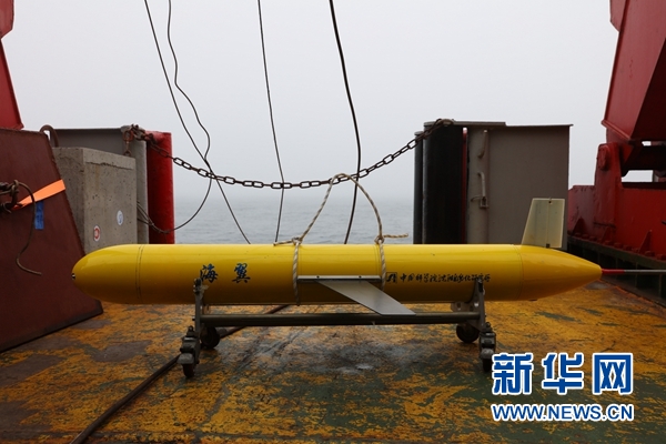 北京時(shí)間28日5時(shí)23分,考察隊(duì)隊(duì)員們將“海翼”號(hào)水下滑翔機(jī)緩緩送入海中。在成功入海后,“海翼”號(hào)開始對(duì)所在海域執(zhí)行剖面觀測(cè)。
