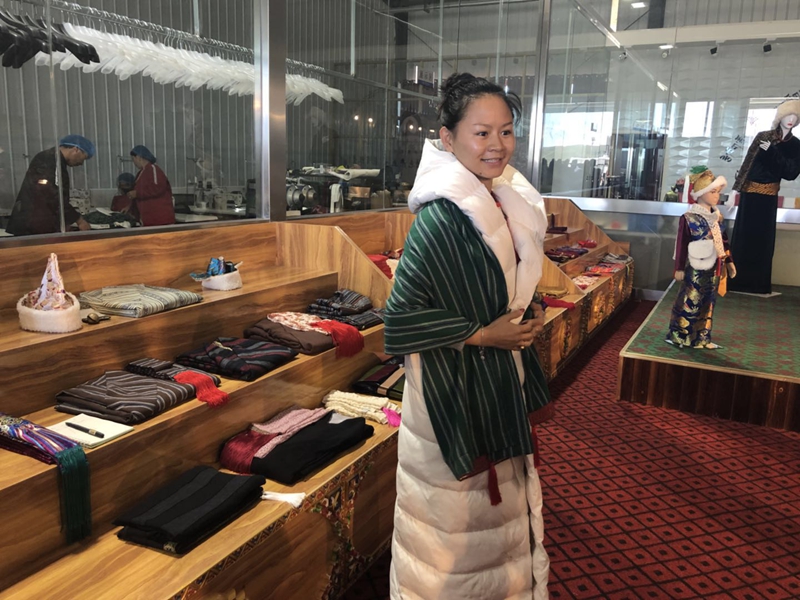 28歲的東格央宗拉姆對自己店內(nèi)的服裝如數(shù)家珍。她的服裝公司今年6月剛剛起步,當(dāng)?shù)卣悦吭旅科椒矫?0元的低租金為她這樣的創(chuàng)業(yè)者提供廠房。