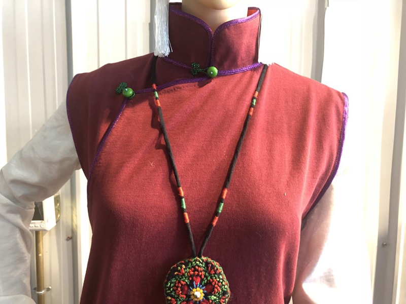 “這件衣服,我設(shè)計時結(jié)合了旗袍和藏族服飾的特征,盤扣采用了旗袍的設(shè)計,但是領(lǐng)邊是藏服特有的設(shè)計。”
