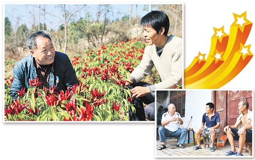 左上圖 張東堂(左)在貧困戶家的辣椒地里查看辣椒長勢?!∮蚁聢D 張東堂(左一)來到貧困戶家中家訪。 經(jīng)濟日報-中國經(jīng)濟網(wǎng)記者 郭靜原攝