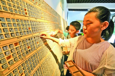 7月16日,山東省臨沂市沂南縣竹泉村,研學(xué)旅行的孩子們在“時光印記活字印刷體驗館”內(nèi)體驗活字印刷。暑假期間,各地的孩子們紛紛通過豐富多彩的形式“學(xué)藝”充電。新華社發(fā)