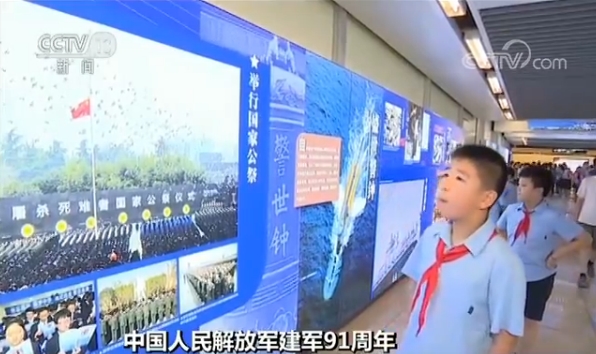 八一前夕,江蘇南京市首個(gè)國(guó)防教育主題車(chē)站建成開(kāi)放,地鐵通道“變身”國(guó)防展覽展廳,營(yíng)造濃厚八一節(jié)日氛圍。展覽主題為“愛(ài)我國(guó)防愛(ài)我軍”,一幅幅圖片濃縮著人民軍隊(duì)91年的光輝歷程。聲光電立體展示,吸引來(lái)往乘客和市民駐足參觀。