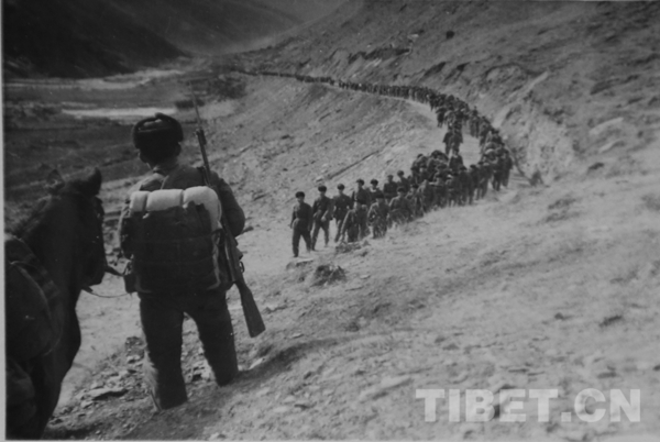 圖片為西藏文工團(tuán)老照片:第三文化工作隊(duì)向乃堆拉的山口前進(jìn),王勉之是旗手。 圖片由王勉之提供