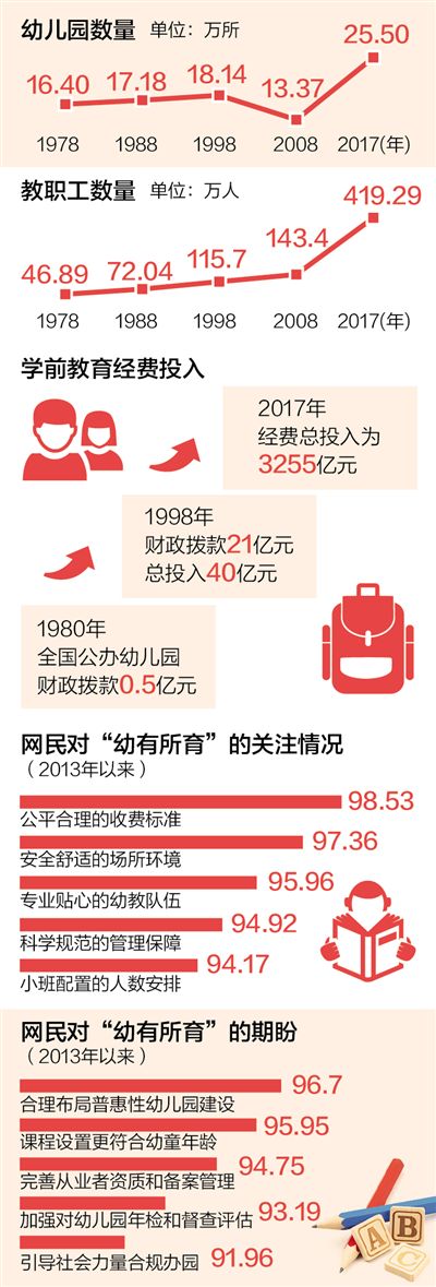 黨的十九大報(bào)告提出,在幼有所育、學(xué)有所教、勞有所得、病有所醫(yī)、老有所養(yǎng)、住有所居、弱有所扶上不斷取得新進(jìn)展。改革開放40年來,學(xué)前教育蓬勃發(fā)展,從“不入園”到“想入園”,從“能入園”到“入好園”,“幼有所育”大步向前。