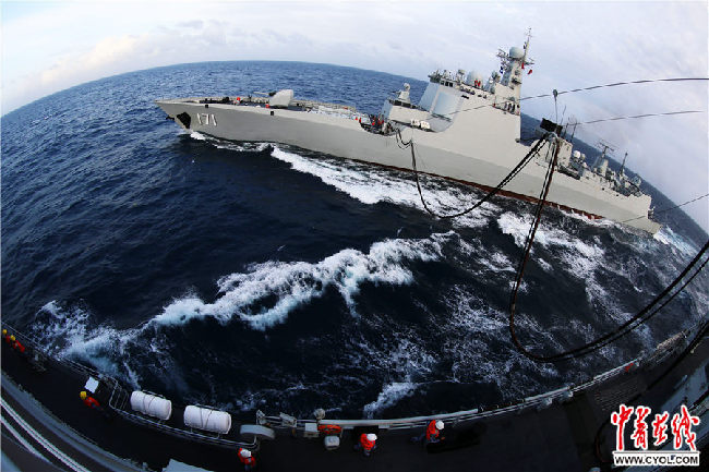 2017年2月6日,??谂瀰⒓舆h(yuǎn)海訓(xùn)練,圖為??谂炦M(jìn)行橫向補(bǔ)給。時(shí)明華攝