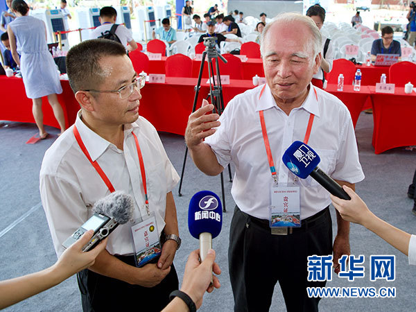 8月5日,在福建晉江舉行的福建向金門供水工程通水現(xiàn)場會上,來自金門的王再生老人(右)和福建省水投集團公司副總經(jīng)理朱金良(左)接受采訪。 新華社記者 姜克紅 攝