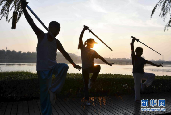 8月3日,亳州市市民在渦河公園晨練健身。盛夏時(shí)節(jié),安徽省亳州市不少市民走出家門,通過習(xí)練太極拳、太極劍等運(yùn)動方式,享受晨練健身帶來的樂趣。 新華社發(fā)(劉勤利 攝)