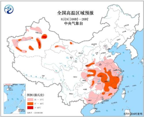 據(jù)中央氣象臺網(wǎng)站消息,中央氣象臺8月9日06時(shí)繼續(xù)發(fā)布高溫黃色預(yù)警:預(yù)計(jì)8月9日白天,陜西中南部、黃淮大部、江淮、江漢、四川盆地東北部、江南大部、華南中東部、甘肅西部及新疆南疆盆地和沿天山一帶等地的最高氣溫有35~36℃。