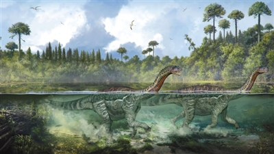 科學(xué)家依據(jù)此次發(fā)現(xiàn)的疑似游泳跡繪出了復(fù)原圖,這些龐然大物游泳時可能通過后肢交替運動,像槳一樣提供推力,類似于現(xiàn)生雙足行走動物的“狗刨式”。(記者 王?。?/p>