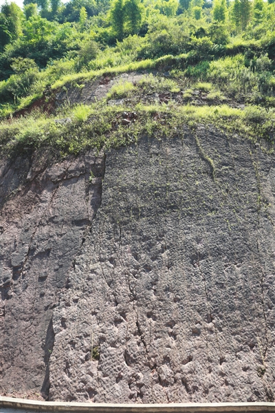 2013年夏,茅臺鎮(zhèn)赤水河畔的釣魚臺酒業(yè)公司在建設(shè)制酒車間時,考慮到后側(cè)邊坡地帶巖層不夠牢固,便對邊坡進行清理。清理至下部半米時發(fā)現(xiàn)一個完整的巖石平面,質(zhì)地堅硬,有許多凹凸和深淺不一的印痕。2017年夏,該公司員工看到貴州習(xí)水恐龍足跡的報道后,認(rèn)為后山的凹坑可能是某種足跡,于是多方聯(lián)系專家,對比相關(guān)信息。
