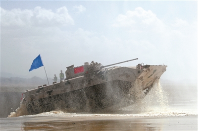 “蘇沃洛夫突擊”步戰(zhàn)車組項(xiàng)目比賽中,中國(guó)參賽隊(duì)?wèi)?zhàn)車穿越涉水場(chǎng)。袁 凱攝