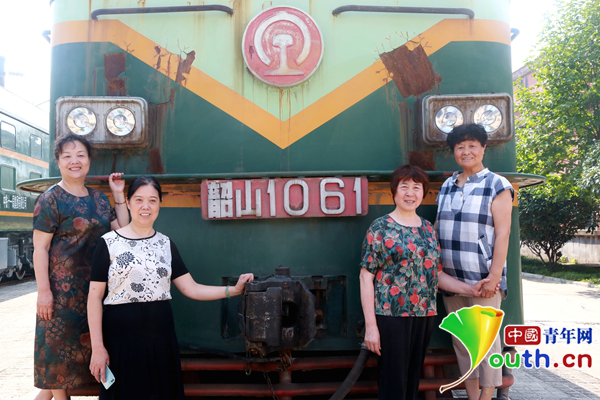2018年,中國(guó)第一代電力機(jī)車(chē)女司機(jī)白燕娥、楊憲美、胡學(xué)政、侯?lèi)?ài)華(從左至右)在曾經(jīng)駕駛過(guò)的機(jī)車(chē)前留影。中國(guó)青年網(wǎng)見(jiàn)習(xí)記者 李慧慧 攝