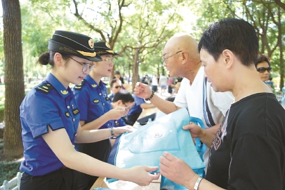 上海市城管執(zhí)法局執(zhí)法總隊“90后”城管向市民發(fā)放普法宣傳資料。