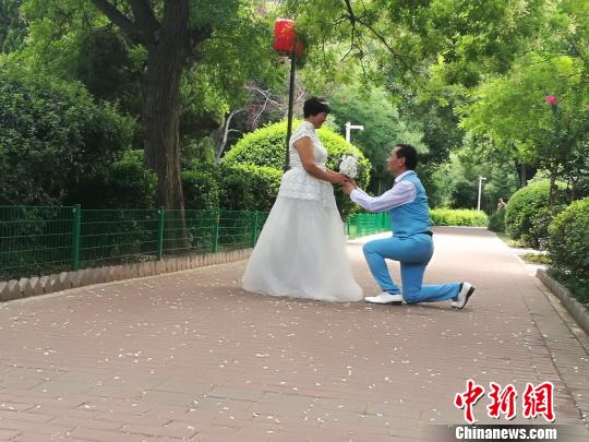 “結(jié)婚這么多年,老伴經(jīng)常念叨,說(shuō)我不夠浪漫,從不給她過(guò)情人節(jié),今天我不僅陪她過(guò)了節(jié)還補(bǔ)拍了婚紗照,以后我也要跟年輕人學(xué)學(xué),經(jīng)常給老伴送花送禮物?!笨粗┗榧喌睦习?,68歲的王在民老人笑得一臉幸福。