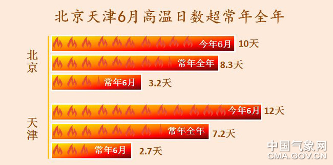 北京、天津6月高溫日數(shù)超常年全年。 王美麗 制圖
