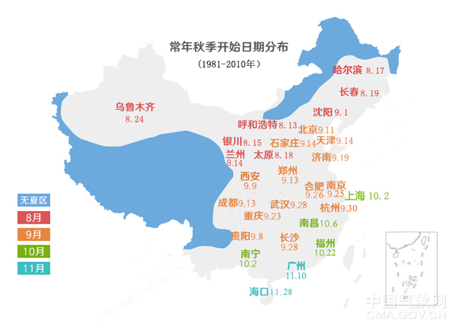 飽受今夏“炙烤”之苦的網(wǎng)友都在盼望著秋天的到來。近期受冷空氣的影響,北方一些城市早晚已經(jīng)能感受到秋天的絲絲涼意,那么真正的秋天還有多遠(yuǎn)?氣象學(xué)上通常以5天滑動平均氣溫穩(wěn)定低于22℃的開始時間為秋季開始。從常年平均來看,8月份能進(jìn)入氣象意義秋季的也只有西北和東北少數(shù)城市,我國大部分地區(qū)還需要等到9月份才能進(jìn)入秋季,而華南沿海和海南,入秋則要等到11月甚至12月。目前來看,近期的幾股冷空氣有可能推動黑龍江、吉林、內(nèi)蒙古一帶入秋,但南方的小伙伴還要多等一些時日。
