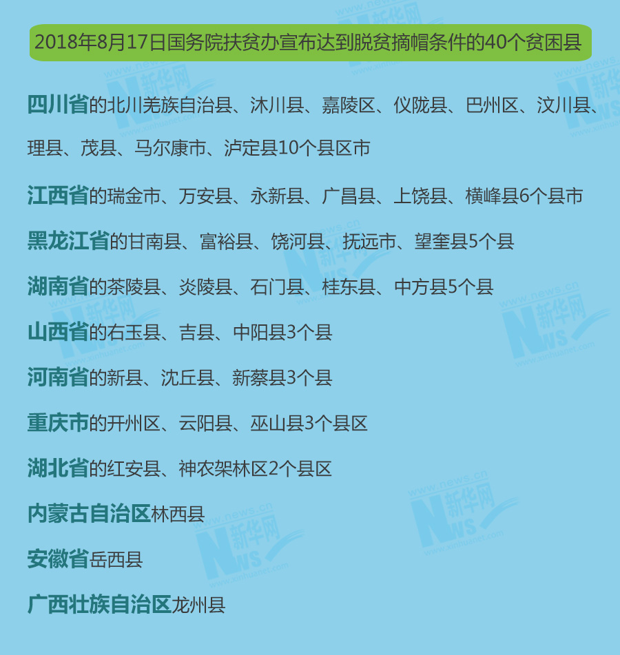 國務(wù)院扶貧辦副主任夏更生表示,此次實現(xiàn)脫貧的40個縣是:四川省的北川羌族自治縣、沐川縣、嘉陵區(qū)、儀隴縣、巴州區(qū)、汶川縣、理縣、茂縣、馬爾康市、瀘定縣10個縣區(qū)市,江西省的瑞金市、萬安縣、永新縣、廣昌縣、上饒縣、橫峰縣6個縣市,黑龍江省的甘南縣、富??h、饒河縣、撫遠(yuǎn)市、望奎縣5個縣,湖南省的茶陵縣、炎陵縣、石門縣、桂東縣、中方縣5個縣,山西省的右玉縣、吉縣、中陽縣3個縣,河南省的新縣、沈丘縣、新蔡縣3個縣,重慶市的開州區(qū)、云陽縣、巫山縣3個縣區(qū),湖北省的紅安縣、神農(nóng)架林區(qū)2個縣區(qū),內(nèi)蒙古自治區(qū)林西縣,安徽省岳西縣,廣西壯族自治區(qū)龍州縣。