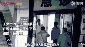 被拽起來(lái)后,抹了把眼淚,又跪在了地上,額頭撞地,嘴里不停地哀求醫(yī)生救自己的母親。