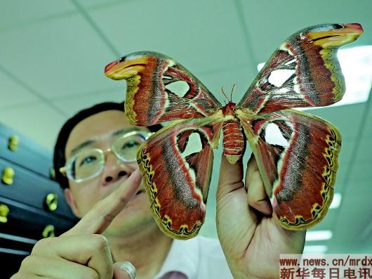 有人害怕蝴蝶和蛾子,以為它們翅膀表面的鱗片有毒。趙力解釋說,其實(shí)那些鱗片和頭發(fā)的成分一樣,人接觸了以后并不會有不良反應(yīng)。