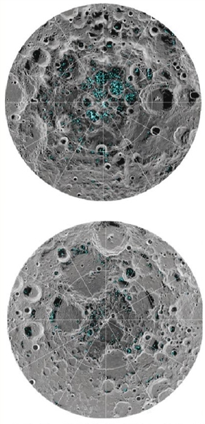 圖中淺藍(lán)色區(qū)域就是發(fā)現(xiàn)水冰的地方,上圖為月球南極,下圖為月球北極。圖/NASA