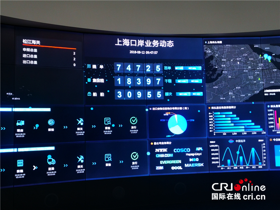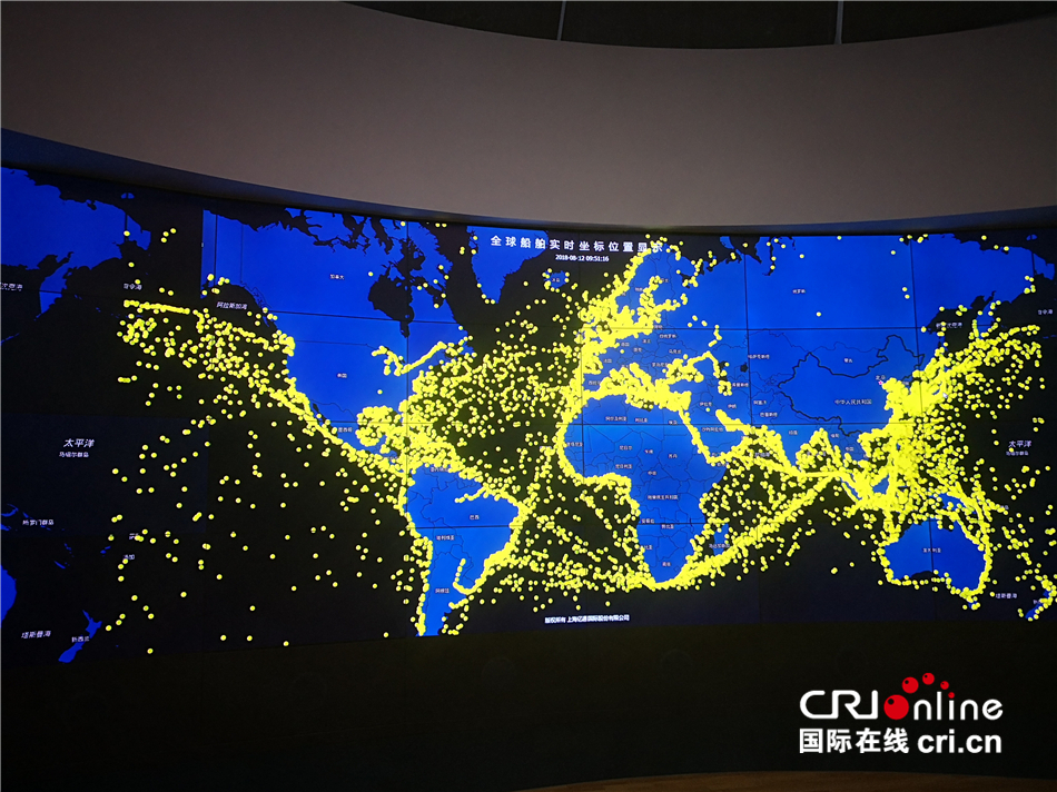 在上海國際貿(mào)易單一窗口運(yùn)營方、上海億通公司的電子大屏上,密密麻麻的黃色光點(diǎn)顯示著全球船舶的實(shí)時坐標(biāo)位置、上??诎稑I(yè)務(wù)動態(tài)等關(guān)鍵信息。