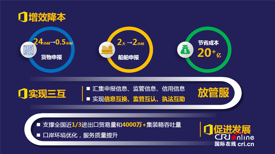 國際貿(mào)易單一窗口的運(yùn)營,為貿(mào)易船舶進(jìn)出上海港大大節(jié)約了時間和成本。辦通關(guān)手續(xù)實(shí)現(xiàn)了從“人跑路”向“信息跑路”的轉(zhuǎn)變,提交的資料由四套系統(tǒng)1113項(xiàng)數(shù)據(jù)簡化為一套系統(tǒng)388個數(shù)據(jù),船舶進(jìn)出港環(huán)節(jié)全流程從原來的2天縮短至2小時,貨物進(jìn)出口申報環(huán)節(jié)全流程從24小時縮短至半個小時。