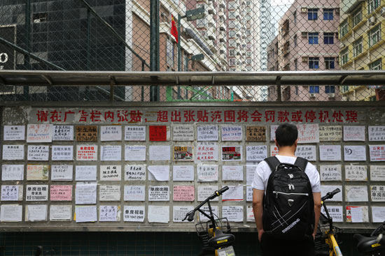 深圳市福田區(qū)崗廈村中的公告欄上貼滿了各種招租求租信息,一層層覆蓋著,圖為一位白領模樣的年輕人在看租房信息,崗廈村里像他這樣的白領還有很多,他們大都在附近的寫字樓里上班。這個位于深圳市中心的城中村房東靠房租可以月入10萬元,白領花千元只能租個床位。視覺中國供圖