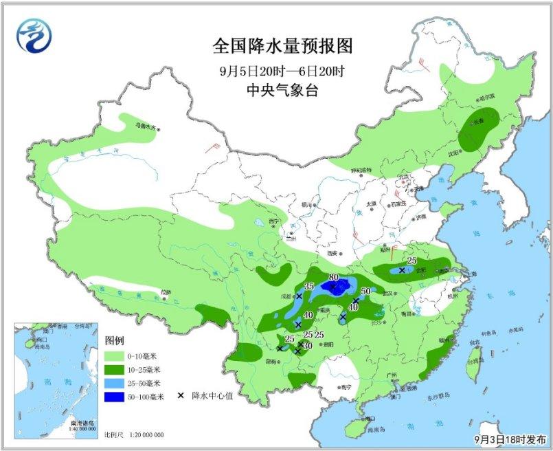 9月5日20時(shí)至6日20時(shí),吉林中部、遼寧北部、陜西南部、四川盆地大部、湖北中西部和東北部、湖南西北部、河南南部、安徽中部、江蘇西南部、福建東南部、廣東東部、云南北部和東南部的部分地區(qū)有中到大雨,其中,四川盆地東部、重慶北部局地有暴雨;新疆北部、內(nèi)蒙古東北部、華北南部、黃淮有4~6級(jí)風(fēng)(見圖3)。