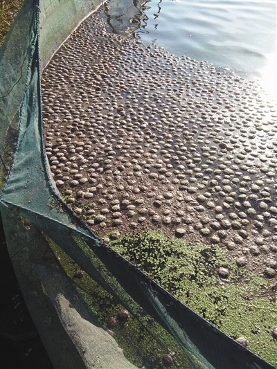 第二天,段廣玉發(fā)現(xiàn),大閘蟹也開始大量死亡,并浮出水面?!按箝l蟹死了之后,先沉下去,再浮上來(lái),所以晚了一天?!睆?6日到28日,不斷有死螃蟹浮出水面,段廣玉總共撈了五六船大閘蟹?!叭妓拦饬?,沒浮上來(lái)的也爛在湖里了,數(shù)量無(wú)法計(jì)算?!?/p>