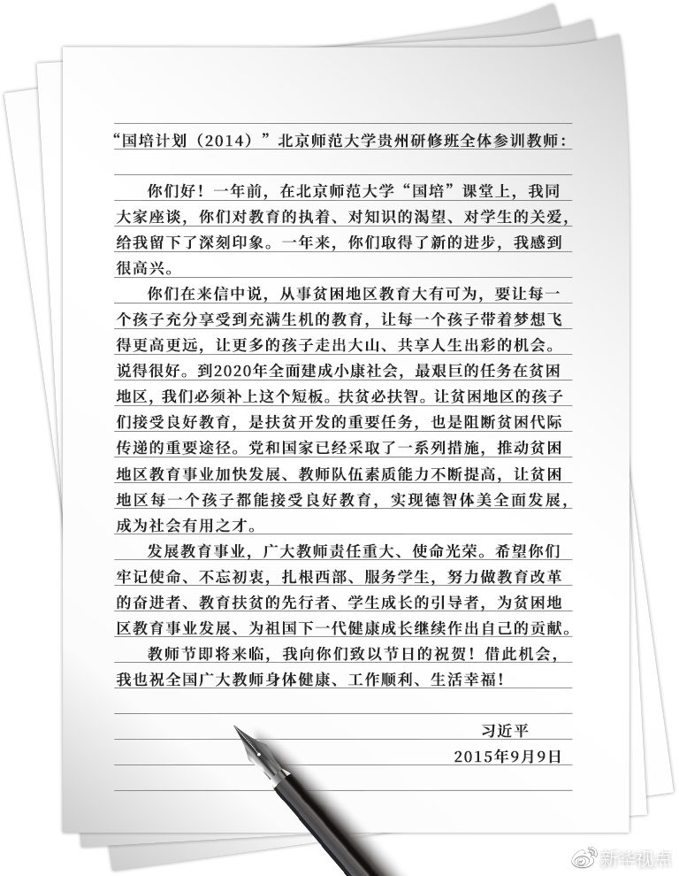 “要讓每一個(gè)孩子充分享受到充滿(mǎn)生機(jī)的教育,讓每一個(gè)孩子帶著夢(mèng)想飛得更高更遠(yuǎn),讓更多的孩子走出大山、共享人生出彩的機(jī)會(huì)?!?015年,“國(guó)培計(jì)劃(2014)”北師大貴州研修班全體參訓(xùn)教師在給習(xí)近平總書(shū)記的信中這樣寫(xiě)道。