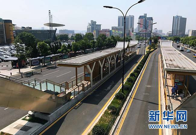 公交專用道設(shè)立在馬路中央,減少了道路兩側(cè)路口以及其他社會車輛對公交運營的影響。新華網(wǎng) 郝多 攝