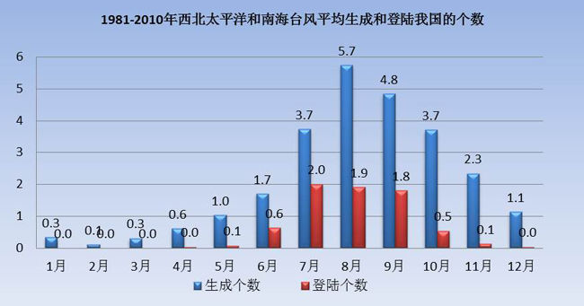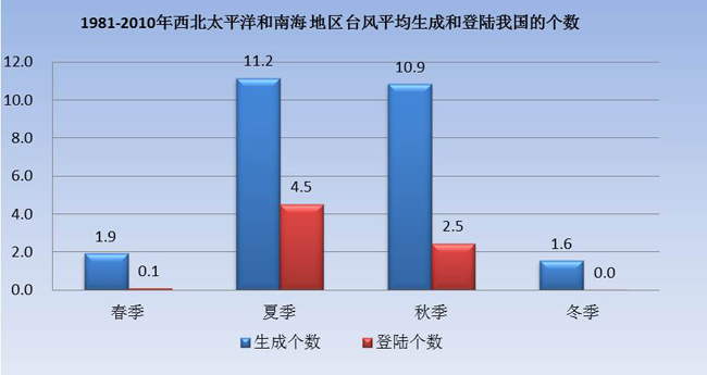 圖2 1981-2010年西北太平洋和南海地區(qū)臺風平均生成和登陸我國的個數 李慧 制圖