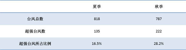 根據西北太平洋和南海生成臺風的歷史資料,常年夏季生成的臺風數量比秋季生成的臺風要多,登陸我國的臺風數量也比秋季多。七八月份生成臺風的個數比九月以后生成的秋臺風要多,但秋季更易出現超強臺風。1949年至2017年,秋臺風共生成787個,其中超強臺風有222個,占比28.2%;這期間,夏季臺風中超強臺風的比例則為16.5%。