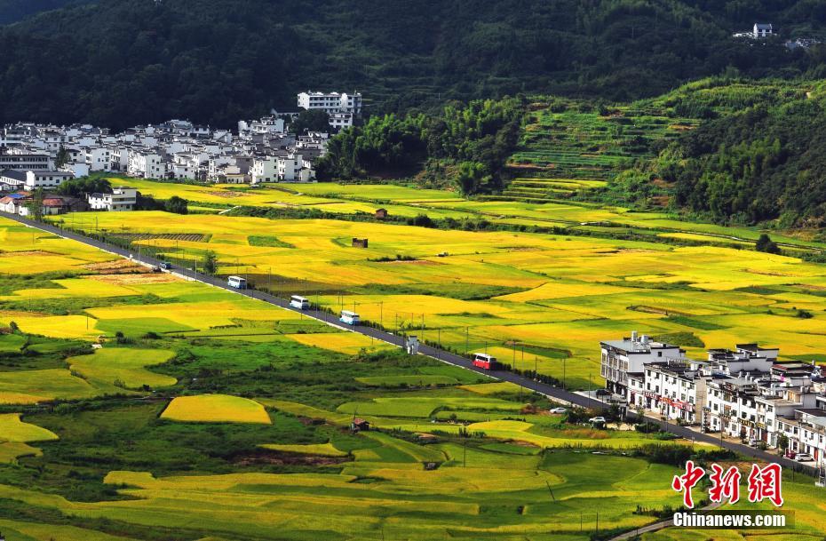 9月13日,在“中國(guó)最美鄉(xiāng)村”的江西婺源縣,正值收獲期的金黃水稻與周邊建筑構(gòu)成了一幅美好的田園豐收?qǐng)D卷。中新社發(fā) 曹加祥 攝