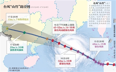具體大風(fēng)預(yù)報(bào)顯示,15日20時(shí)至16日20時(shí),南海中北部、臺(tái)灣海峽、巴士海峽、臺(tái)灣島及其沿海、瓊州海峽、北部灣東部、福建沿海、廣東沿海及廣東中南部、珠江口、香港、澳門(mén)、海南島東部和北部沿海將有7-10級(jí)大風(fēng),陣風(fēng)11-12級(jí);其中南海北部、廣東大部沿海、珠江口、香港、澳門(mén)將有11-13級(jí)大風(fēng),陣風(fēng)14-15級(jí),“山竹”中心經(jīng)過(guò)的附近海面或地區(qū)風(fēng)力可達(dá)14-16級(jí),陣風(fēng)17級(jí)或17級(jí)以上。